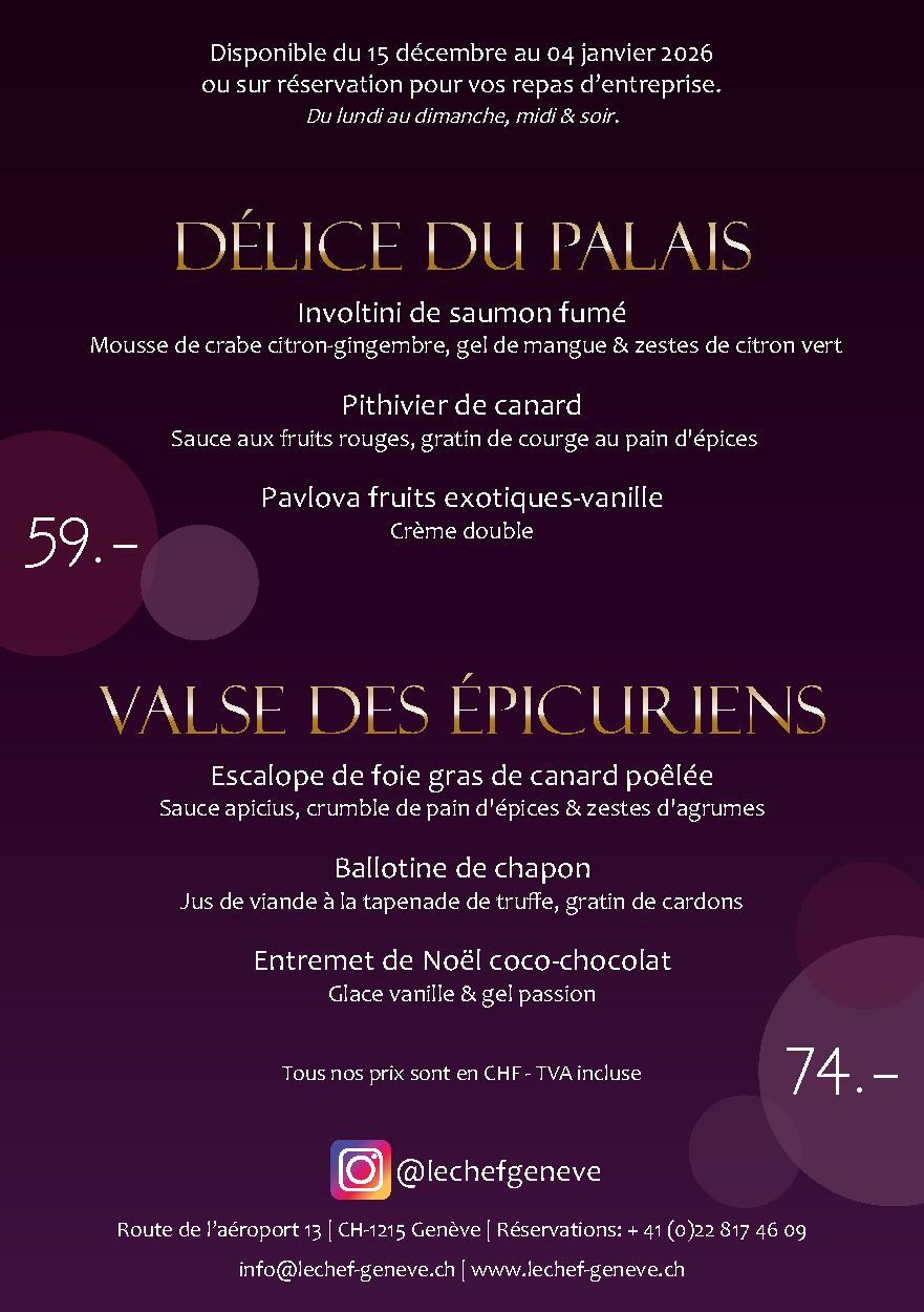 Pour vos événements d'entreprise, nous vous avons concocté un Menu de Noël d'exception au restaurant Le Chef.